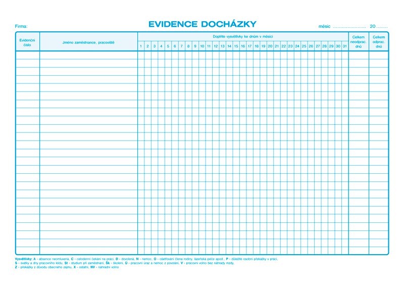 Informační server pro podnikání. Stáhněte si formulář Evidence docházky. Můžete jej pohodlně vyplnit na počítači, uložit v PDF, elektronicky podat nebo vytisknout. Pokud zaměstnanec sám zadává data do evidence pracovní doby (respektive podrobně vedené docházky ), měla by taková evidence podléhat následnému schválení ze strany zaměstnavatele. Tím zaměstnavatel splní svou evidenční povinnost, jež není uložena zaměstnancům, ale právě zaměstnavatelům.